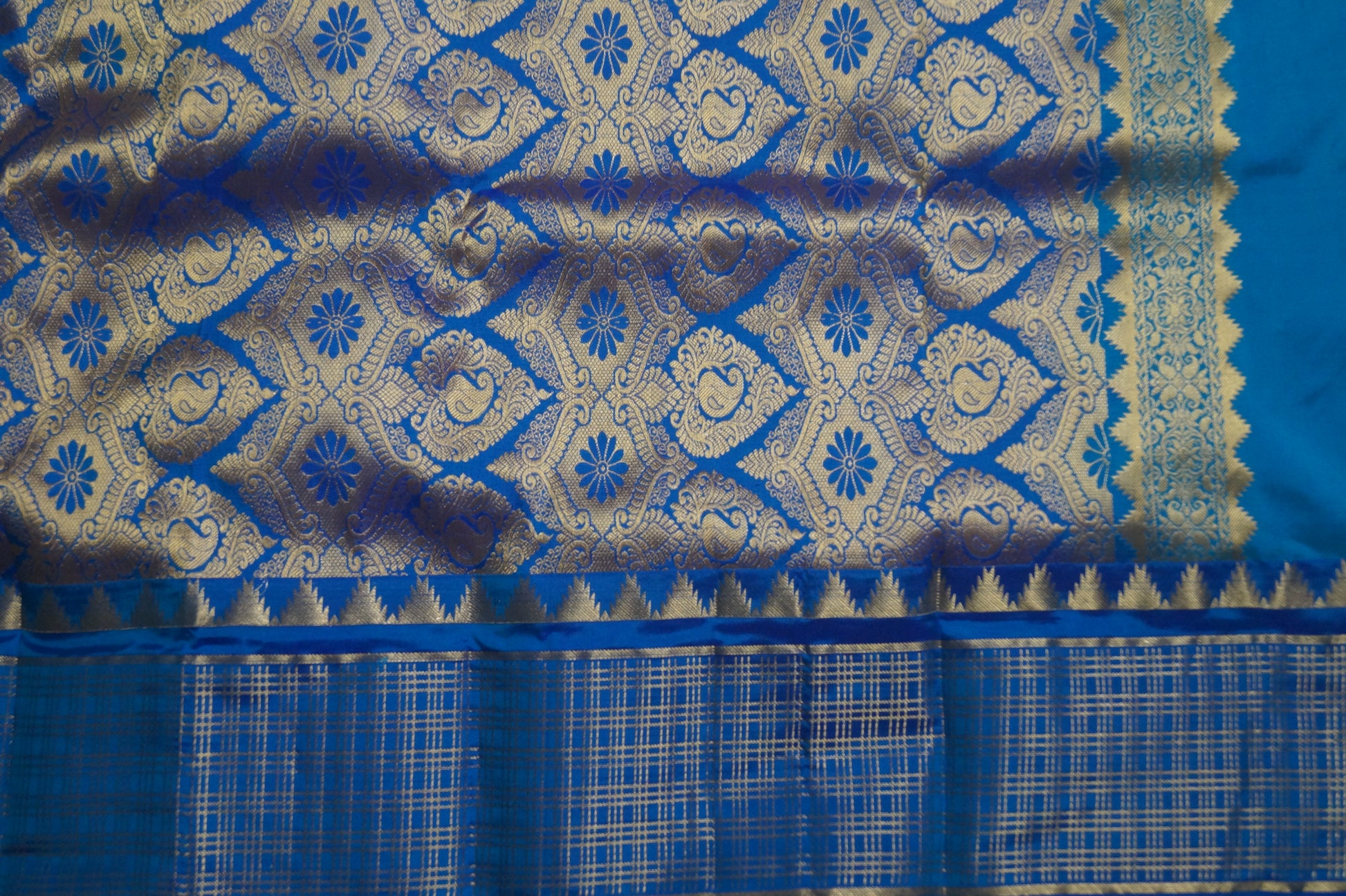 This Pure Kanchi Silk Saree in a rich blue shade features meticulously woven buttas, showcasing traditional craftsmanship. The lustrous silk offers a smooth texture and elegant drape, making it ideal for formal occasions and ceremonial events. Its timeless design combines heritage artistry with enduring quality, ensuring a sophisticated and graceful appearance. Perfect for those who appreciate authentic handwoven silk sarees with detailed motifs.
